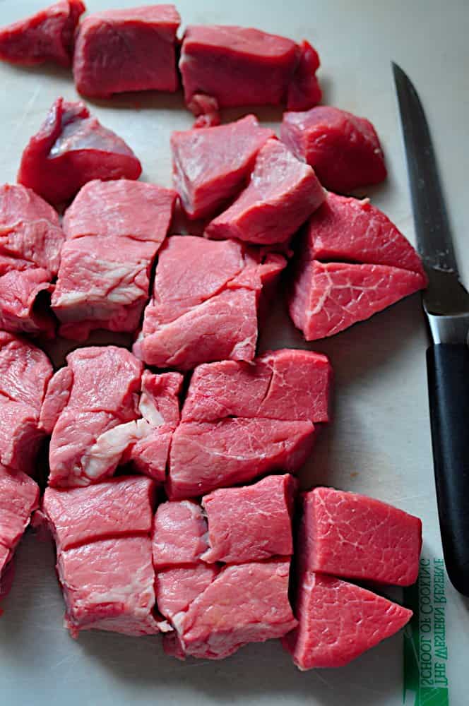 - 2 lbs Sirloin, cut into 2" chunks (I buy thick-cut steaks to start)