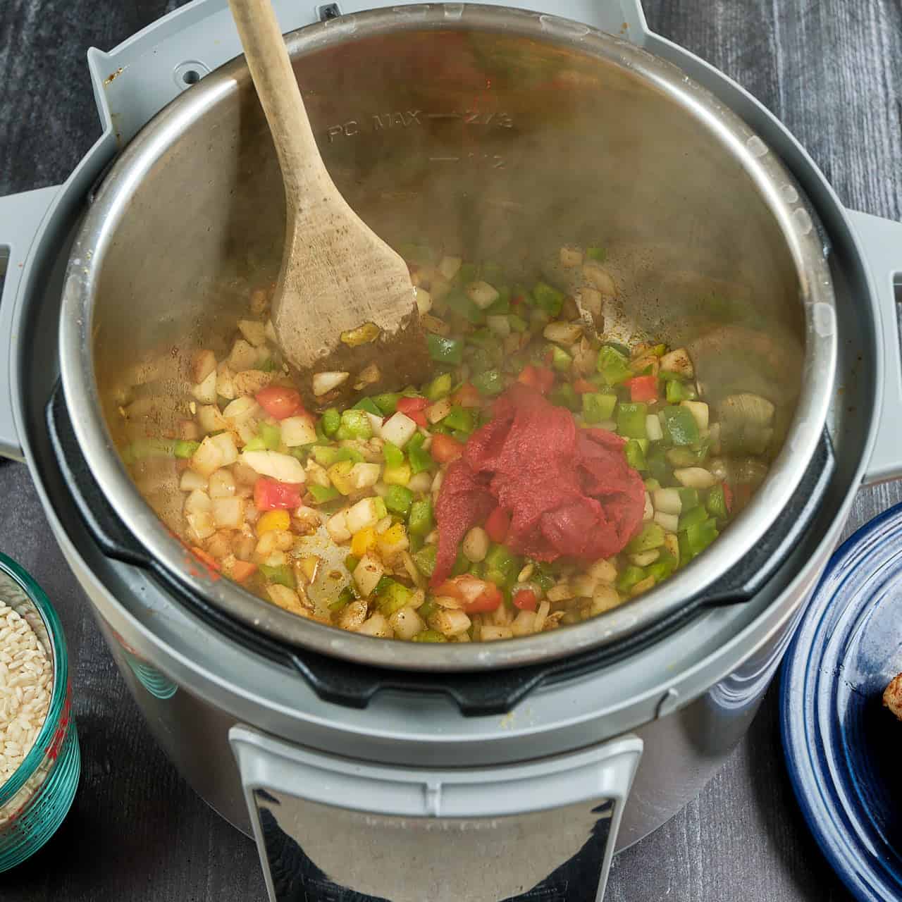 - Sauté the aromatics: Add the diced onion, bell pepper, and smashed garlic to the pot, sprinkle with ½ teaspoon of salt, and sauté until the onions soften, about 5 minutes, stirring and scraping with a flat-edged wooden spoon to unstick any browned bits from the bottom of the pot. Stir the tomato paste into the onions and sauté for 1 minute, often scraping the bottom of the pot.